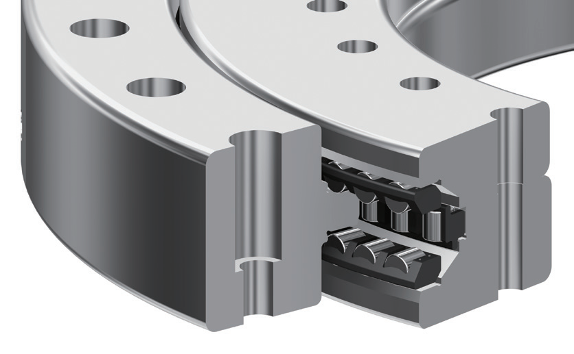 采用軸向2列,徑向1列的滾柱排列構(gòu)造,具有較高的力矩剛性,非常適合用于五軸機(jī)床的回轉(zhuǎn)工作臺(tái)。