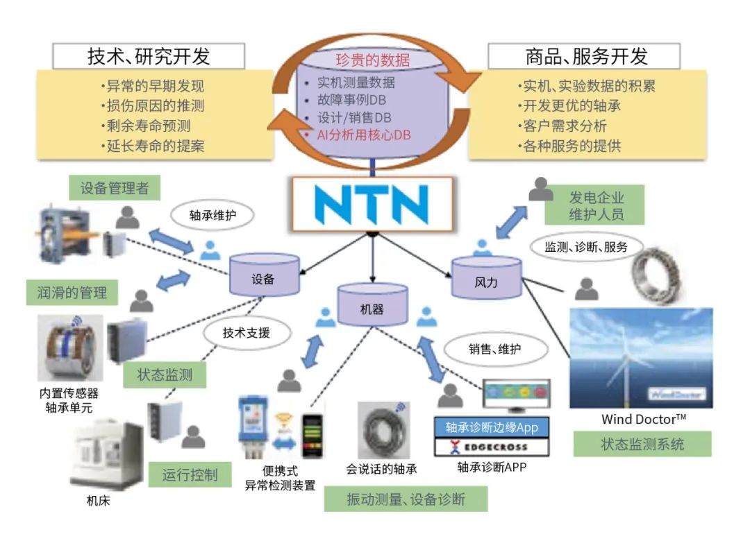 在支持人類生活活動(dòng)的各種設(shè)備中,滾動(dòng)軸承是組裝于其中的機(jī)械要素部件。由于機(jī)械部件的故障造成設(shè)備停止運(yùn)行會(huì)導(dǎo)致利益損失,為了防止出現(xiàn)這些故障情況,監(jiān)測(cè)軸承周邊的溫度、振動(dòng)非常重要。NTN將軸承和傳感機(jī)能融合開發(fā)了帶傳感器軸承,并且致力于提供軸承的狀態(tài)監(jiān)測(cè)服務(wù)。根據(jù)監(jiān)測(cè)到的信息,面向客戶遇到的問題,提供有效的服務(wù)和解決方案。
