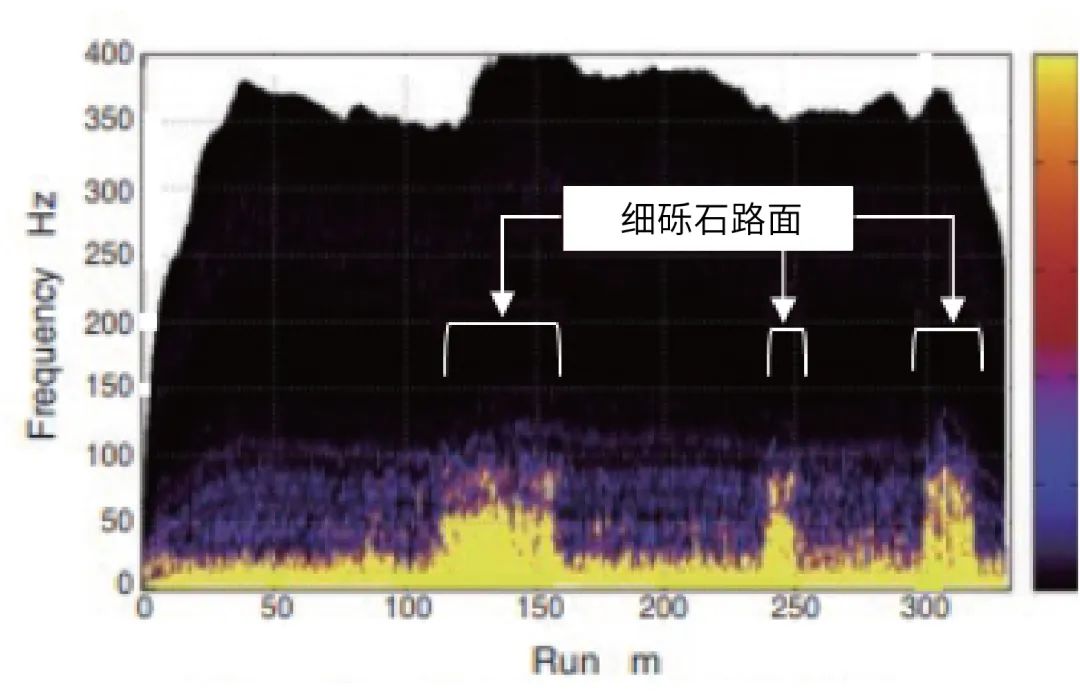 車輪旋轉(zhuǎn)信號(hào)包括輪胎狀況(氣壓等)和路面狀況的影響。通過分析高分辨率的旋轉(zhuǎn)信號(hào),我們可以更準(zhǔn)確地檢測(cè)輪胎狀況和路面狀況的差異。例如,當(dāng)經(jīng)過一段礫石覆蓋的瀝青路時(shí),轉(zhuǎn)速變動(dòng)頻譜如圖3所示。使用這種高分辨率信號(hào)可以進(jìn)一步增強(qiáng)汽車控制的功能。