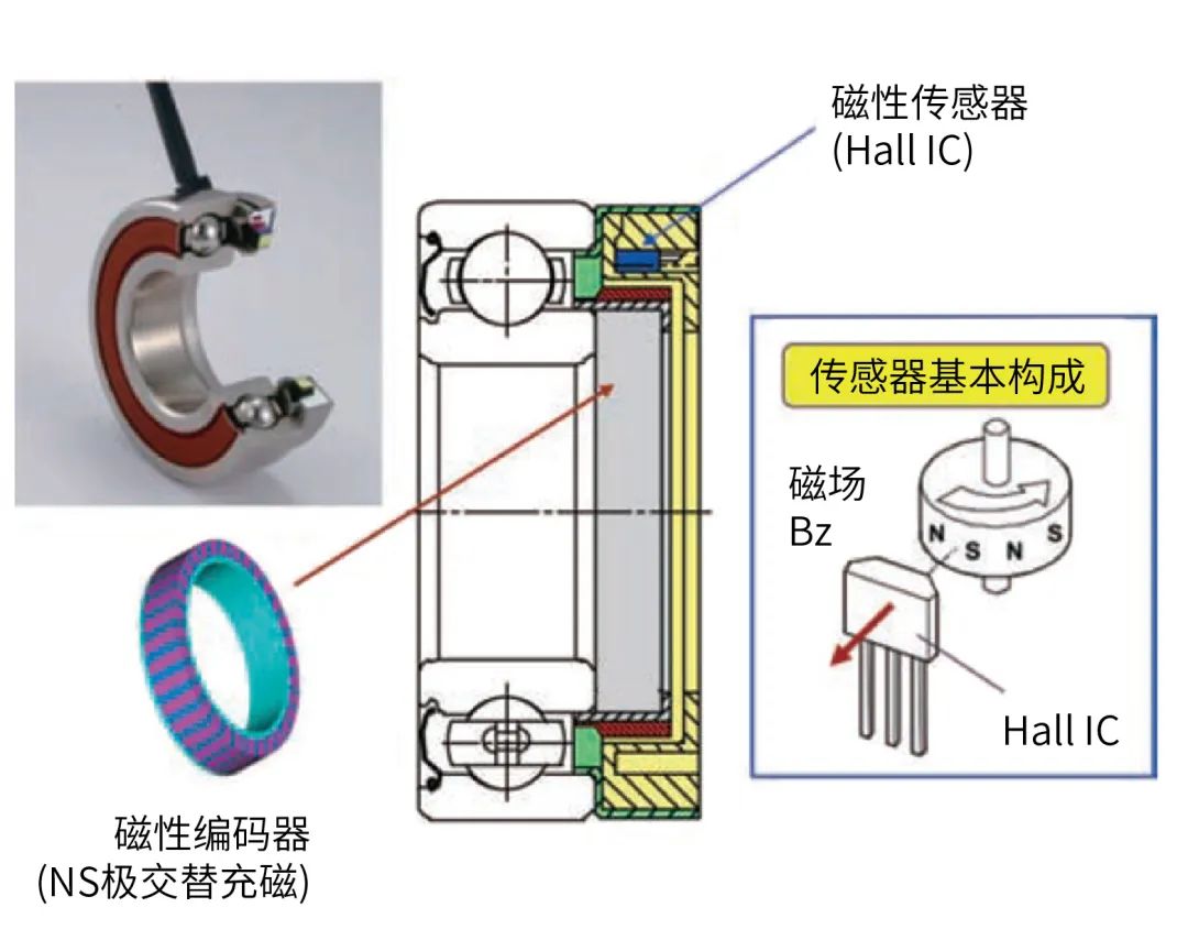 帶旋轉(zhuǎn)傳感器軸承如圖1所示,其構(gòu)造為在軸承的內(nèi)部裝入了磁性傳感器和磁性編碼器,已有標(biāo)準(zhǔn)深溝球軸承數(shù)個(gè)型號(hào)實(shí)施了產(chǎn)品系列化。由于使用了磁性傳感器,和一般的光學(xué)傳感器相比,它耐污染,也可以在高溫環(huán)境中使用。這種軸承適用于叉車上的驅(qū)動(dòng)電機(jī)控制和車輪防滑控制。