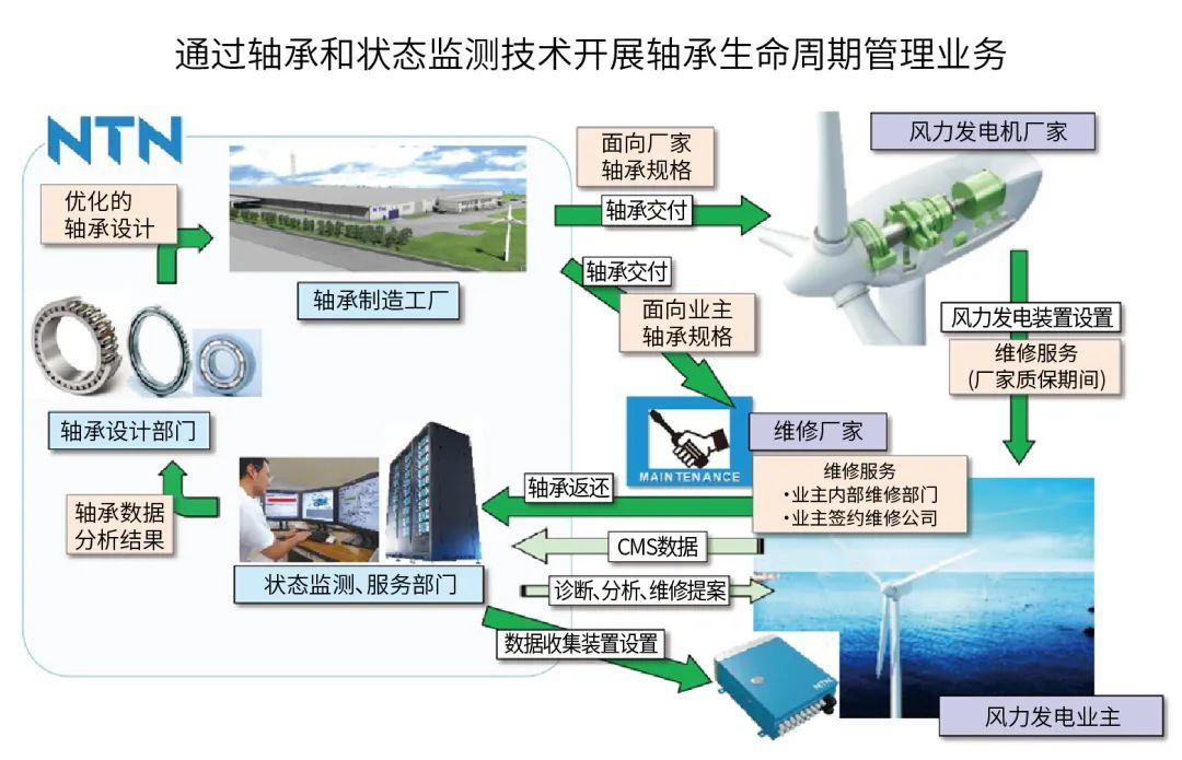 在風(fēng)力發(fā)電領(lǐng)域,NTN與Hokutaku有限公司合作,啟動(dòng)了維護(hù)業(yè)務(wù)。通過基于CMS信息優(yōu)化風(fēng)力發(fā)電設(shè)備的運(yùn)行和維護(hù)(智能維護(hù)),并在軸承開發(fā)和采購以及運(yùn)行和維護(hù)服務(wù)方面進(jìn)行合作,如圖14所示,開展軸承生命周期管理業(yè)務(wù),努力貢獻(xiàn)于社會(huì)。