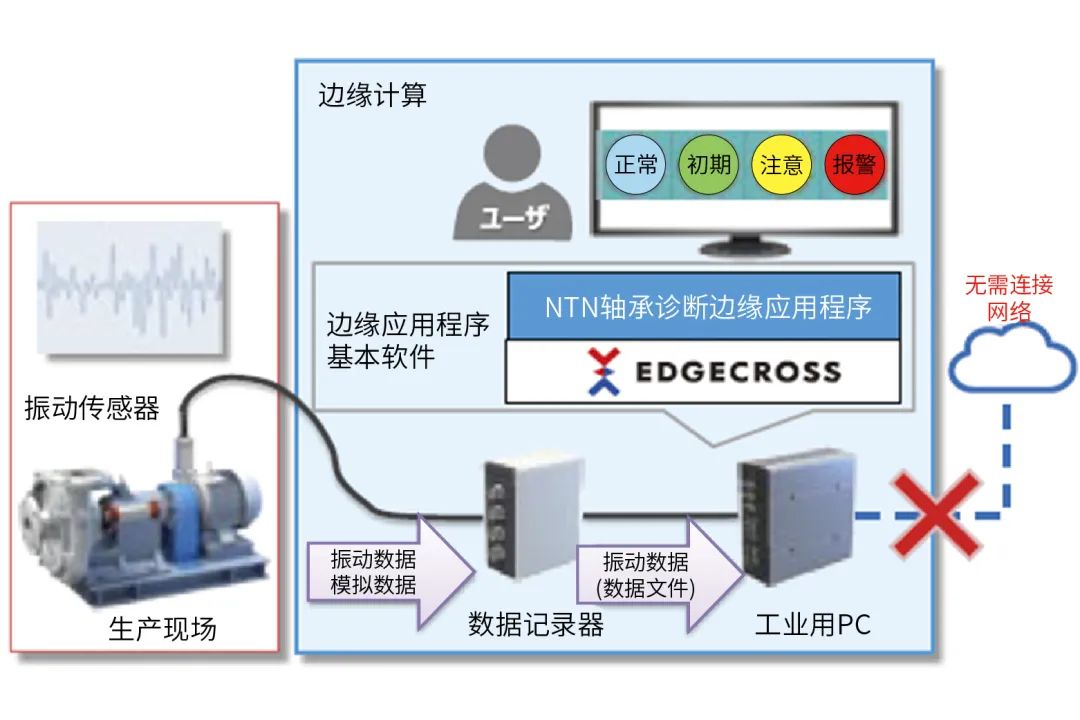 NTN在IoT平臺(tái)Edgecross6)上開發(fā)了作動(dòng)軸承診斷應(yīng)用程序(圖8),并提供不需要接入互聯(lián)網(wǎng),不需要進(jìn)行詳細(xì)的設(shè)定便能提供狀態(tài)監(jiān)測(cè)功能7)的工具。詳情請(qǐng)參考相關(guān)講解報(bào)道。