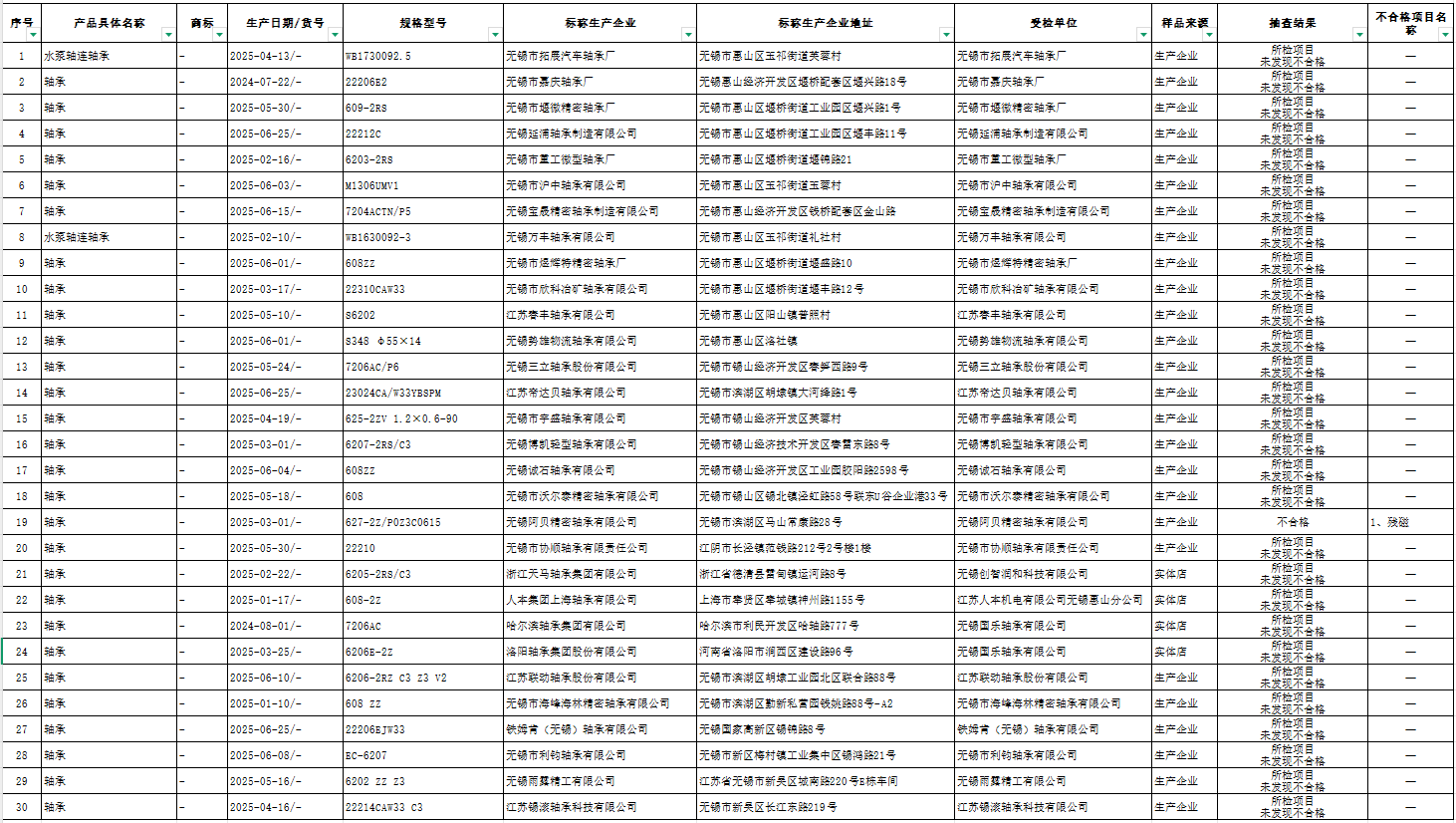 2025年度,無錫市市場監(jiān)督管理局對軸承產(chǎn)品質(zhì)量進(jìn)行了監(jiān)督抽查。共抽查產(chǎn)品30批次,不合格產(chǎn)品1批次,不合格發(fā)現(xiàn)率為3.3%。